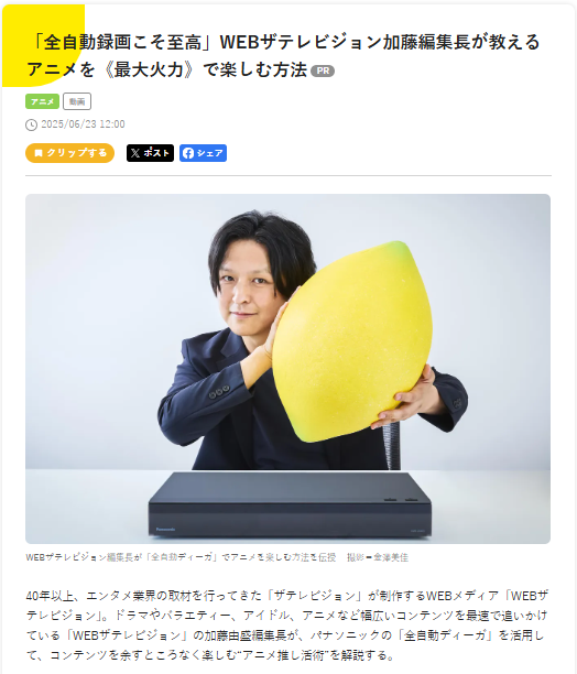 ●「WEBザテレビジョン」加藤由盛編集長による「全自動ディーガ」を活用した“アニメ推し活術”解説記事