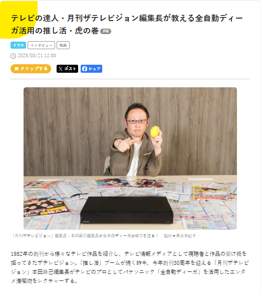 ●「月刊ザテレビジョン」本田麻己編集長による「全自動ディーガ」を活用したエンタメ満喫術レクチャー記事